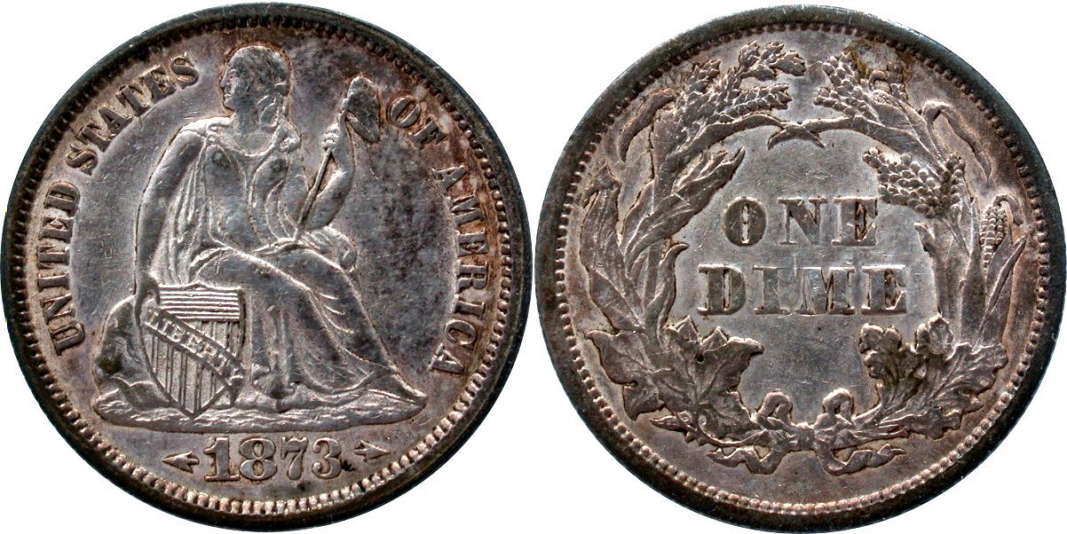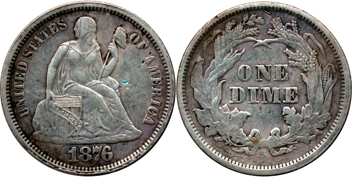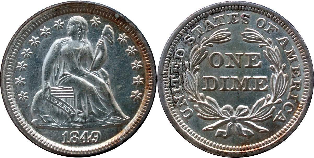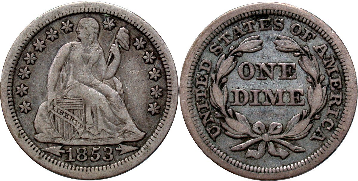 It is doubtful that this 1867-S dime will ever find its way into a TPG holder as the piece has been dipped along with rims marks below the date. The strike is about as good as it gets for the 1867 San Francisco issue with minor strike doubling on the reverse. Rub, if any, is negligible.
