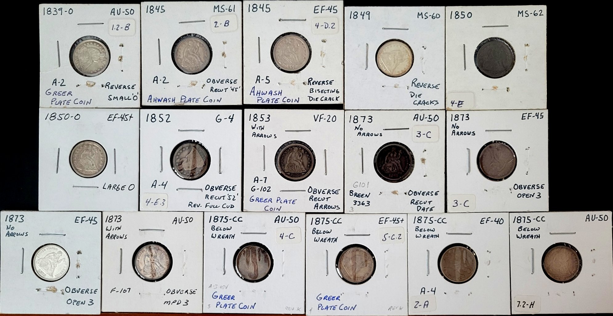 I'd like to reassure those collectors who made specific requests for raw web-book plate coins that I have not forgotten you. From memory, there at five collectors who took the time to look through my Liberty Seated dime online reference and made specific requests. Those requests are sitting in the email Inbox and will be researched either next week or once we have transitioned to Florida. Once re-establishing the GFRC Florida office, there will be time to check through the die variety 2x2 boxes making a determination on what is still available.