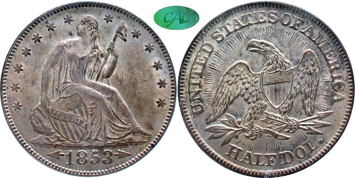 Gem $7000 New October 3! Gem Original, Newtown Collection.. Consignor Price Reduction - A medium dusting of crust covers both sides, more heavily on the reverse. The originality is immediately apparent, with antique, hairline-free surfaces easily visible under the skin. Star centers are sharp while separation of the left claw joints is evident, if weakly so. WB-1, with the date sloping down and a large mintmark. CAC has approved but 28 coins in all grades, a lower total among Seated half dollars, four pieces in MS64, and no examples finer. PCGS notes nine coins at MS64 and no pieces higher. The CAC price guide value is $7,900. Ex. Heritage (January 2018, lot 3720), at $6,000 – a prescient purchase on the part of the consignor, who was able to acquire this top-pop PCGS/CAC example at an attractive price. Housed in a PCGS Gen 6.0 (2015-2020) holder with CAC approval. PCGS #6291.