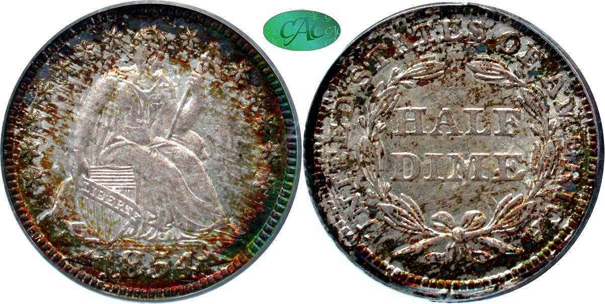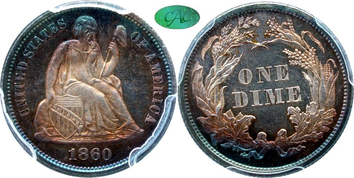 Choice $6000 New October 19! Civil War Rarity, Near-Gem Original, White Pine Collection.. The White Pine collection is full of low-mintage pieces, and this issue is similarly scarce, with a production of 6,870 coins. Even gold shading covers the steely, reflective surfaces of this example, with traces of frost evident in the protected areas. Liberty is neatly outlined by copper patina and the overall eye appeal is pleasing. PCGS Coin Facts indicates market availability of less than three pieces per year, a number that includes non-CAC pieces. CAC has certified only 12 coins in all grades with three pieces in EF45 and eight examples finer. The CAC price guide value is $5,000.Housed in PCGS Gen 4.6 (2013-2014) holder with CAC approval.