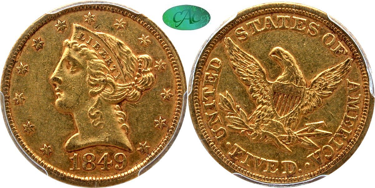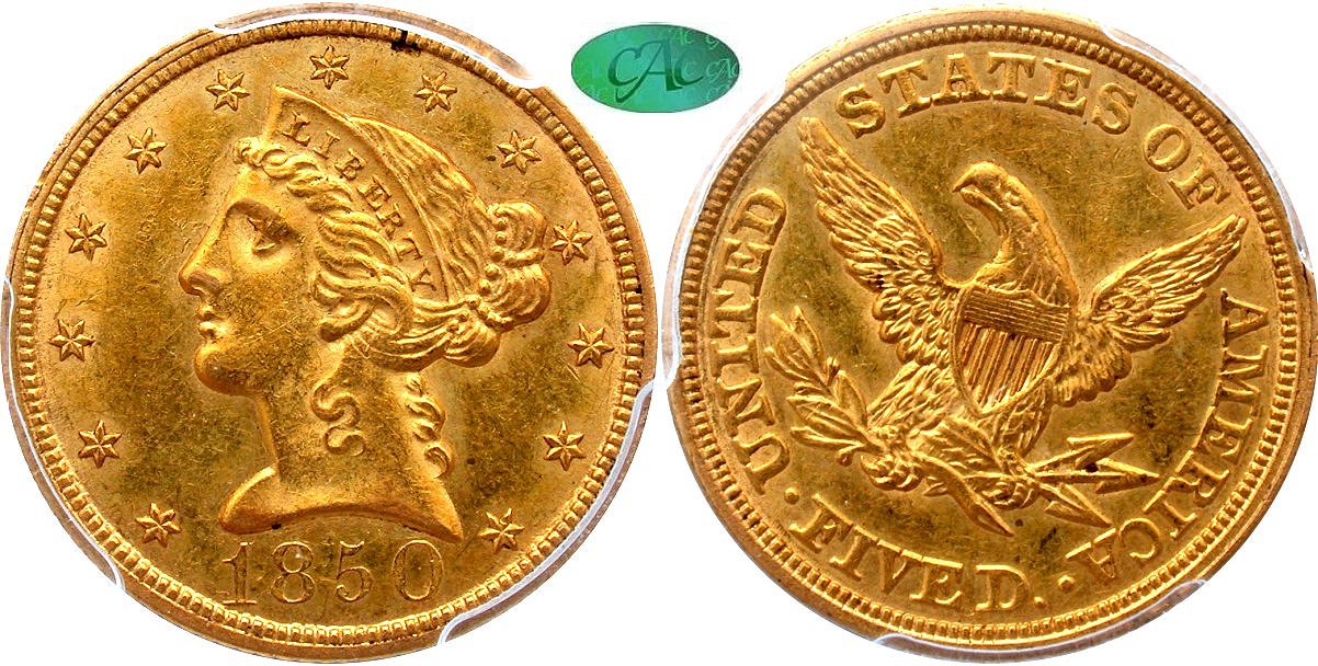 Choice $2650 New October 19! Choice Original, A Type Set Offering, Island City Collection.. Rich orange-gold patina blankets both sides, with deeper shades evident in the stars. Original Mint bloom is present in the protected areas, within the figure of Liberty and the reverse legend. Even though production of the 1847 issue was relatively plentiful, the CAC population is remarkably low when compared to 20th century gold series. CAC has approved 112 coins, nine pieces in AU50, and 62 examples finer. The CAC price guide value is $2,650. Housed in a PCGS Gen 3.1 (1993-1998) old green holder with CAC approval. The combination of a classic gold coin with the old green holder is, in our opinion, more attractive than the current PCGS presentation, which employs blue tags.