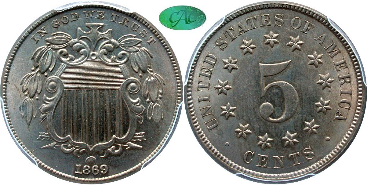 New September 24! Heavy Coin Gray Crust, Scarce Die Pairing. The 1869 F-104a designation captures the only Short Flag 1 prod die pairing, but in a later circulation die state. The business strike state was initially considered to be quite rare, but over the years, a few have appeared per the GFRC Sales Archive. This is the classic case of Cherrypickers search bourse floors for these prizes. Still quite scarce, the Lakeland Collection is offering this F-104 specimen with thick crusty surfaces with embedded aquamarine and gold under a bright light. The fields are reflective as expected from proof dies. There are a few contact marks in the fields well hidden by the patina. Housed in new large font NGC holder.