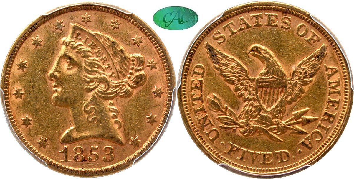 Choice $1450 New October 19! Choice Original, White Pine Collection.. Ostensibly a common date in the No Motto Liberty five series, even the 1853 issue becomes challenging when strict originality is considered. CAC has approved less than a hundred pieces since inception (2007), even including the recent Fairmont sales. This two-tone example reveals steely, frosted luster in the stars and legend, contrasting with warm gold fields. CAC notes 88 coins total, with 11 pieces certified at the AU55 level and 39 examples finer. The CAC price guide value is $1,600. Housed in a PCGS Gen 6.1 (2020-2025) holder with CAC approval. The PCGS label indicates the Fairmont Collection pedigree.