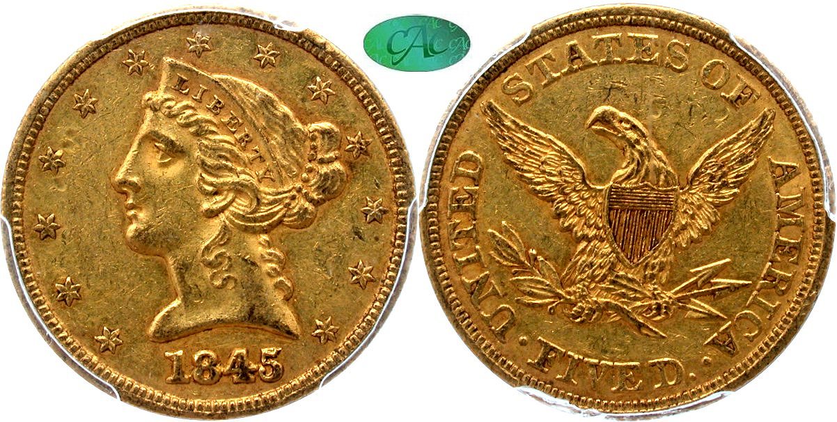 Choice $1550 New October 19! Choice Original, White Pine Collection.. While the 1845 Philadelphia issue represents a more common date among the Liberty fives, the situation becomes challenging when considering CAC certification, as many pieces exhibit washed out fields or other impairments. The example reveals original, green-gold surfaces with liberal orange patina in the protected areas. CAC notes 69 coins in all grades, 11 examples in AU55, and 35 pieces higher. The CAC price guide value in AU55 is $1,650. Housed in a PCGS Gen 6.1 (2020-2025) holder with CAC approval. The label indicates the Fairmont Collection pedigree.