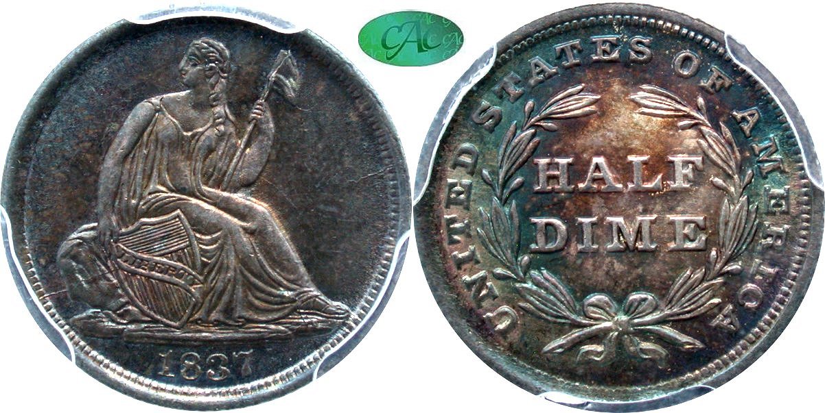 Gem $1450 New October 1! Large Stars, Frosted Luster, Natural Coin Gray Patination, Gem Original. The second year of Liberty Seated half dime and dime production brought stars to the obverse with No Drapery type designation. This 1838 gem would certainly qualify for inclusion into an advanced type set or regular series set. Natural coin gray patination screams originality while the frosted luster is delightful under a bright light. A complete strike is also needed along with a die crack from the right ribbon end to the denticles below. A tad stronger luster would bring this piece into the CAC stickering realm. Housed in a PCGS Gen 6.1 (2020-2025) holder.