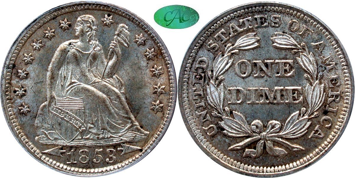 Gem $2200 New October 1! Brilliant Frosted Luster, Bold Strike, Peripheral Gold, Accurately Graded. 1845 brought a substantial increase in Liberty Seated dime production after the anemic 72,500 pieces struck in 1844. Six obverse and seven reverse dies have been documented for a production of 1,755,000 minted. The F-105 and F-105a web-book listings document a die pairing that is available. The infrequently seen F-105a die state captures crossing reverse die cracks at STAT(E)S as is the case with this lovely gem survivor. Brilliant frosted luster is consistent on both sides along with peripheral gold. Strike is well executed for the date with only a touch of weakness on the lower right stars. Die scratches can be seen to the left of the base of the pole with 10x as the strike is powerfully detailed. Accurately grade and housed in new large font NGC holder. Prior sold by GFRC with the prior record in the Sale Archive.