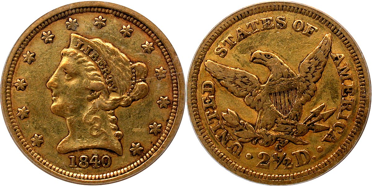 Popular First Liberty Head Issue, Well Struck, Choice Surfaces, Green-Gold Coloring, Lizard King Collection. Students of the U.S. $2.5 Liberty series should take note of this 1840 Charlotte first year offering. Mintage is a tiny 12,822 pieces with only 15 certified by PCGS at the EF40 grade level. This 1840-C example exhibits a strong strike along with green-gold coloring. Please note the fully defined stars and lower hair curls along with well impressed reverse devices. Surfaces are fully choice and unabraded. This new Lizard Collection offering has been to CAC and did not sticker. I have not explanation and still consider this piece to be choice and worthy of an advanced collection. Housed in PCGS Gen 4.1 (1998-2002) holder. December 1969