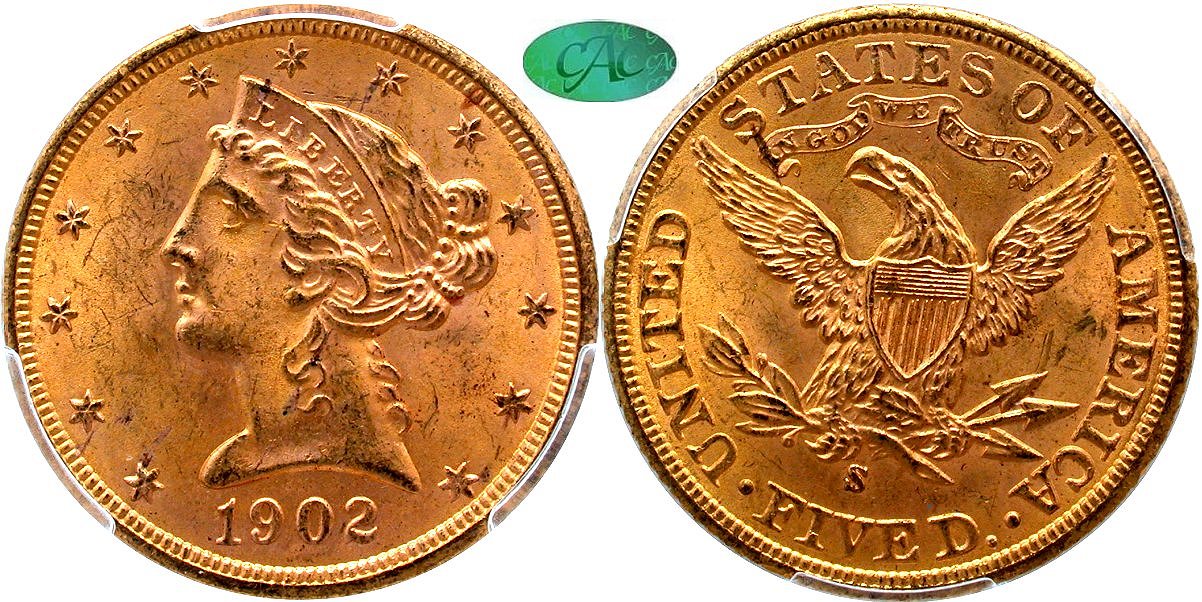 Brilliant Frosted Luster, Swirling Cartwheels, Honey-Gold Coloration, Well Preserved Surfaces. This 1902-S $5 Lib is certainly worthy of is (+) grade as the preservation is superb. Granular frosted luster radiates once placed under a light source. The swirling cartwheels are equally satisfying. Coloration is a classic honey-gold for the issue. The CDN CAC Price Guide is quite fascinating as a straight MS65 is priced at $3500 with more than doubling at the next grade. The GFRC offer price is consistent with the (+) grade for sure. Housed in PCGS Gen 6.1 (2020-2022) holder with CAC holder. The label captures the Fairmont Collection pedigree. December 1969