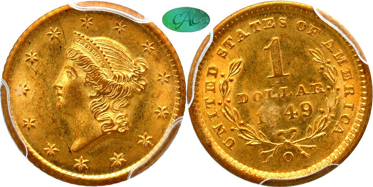 First Gold $1 From New Orleans, Brilliant Frosted Luster, Vibrant Cartwheels, Honey Green-Gold. 1849 brought the production launch of the $1 gold dollar at the New Orleans mint with 215,000 struck. Most entered circulated in the deep south resulting in the majority of survivors being in the circulated grades. Gem survivors are very rare with the MS64 level being the ideal "value" grade as premiums escalate quickly. The Osprey Collection is back with a near-gem example with splendid satiny luster along with vibrant cartwheels. Under angled lighting, the coloration shift to yellow green-gold. The images are accurate as to the in-hand appearance. CAC has approved 11 at the MS64 grade with only five finer. Again, lots of value here for those building a truly advanced set of early U.S. gold. Housed in PCGS Gen 4.5 (2012-2013) holder with CAC approval. December 1969