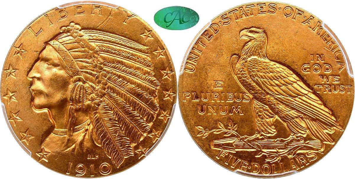 Better Date, Light Honey-Gold, Steely Frosted Luster, Huge Strike. Brilliant steely frosted luster blends with light honey-gold coloration on both sides of this impressive 1910 $5 gold piece. Strike is impressive with deeply impressive motifs. Surfaces are essentially unabraded with a single mark at the obverse easily seen in the images. An ideal coin for assembling a challenging Indian half eagle series of 1908 to 1929 in Mint State. Housed in PCGS Gen 6.1 (2020-2023) holder with CAC approval. December 1969