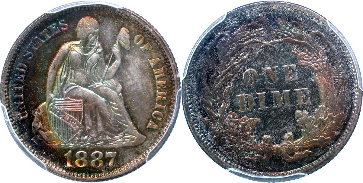 Gem Original.. Price Reduction. Rich color is the hallmark of this late-date proof example, with nearly the entire spectrum represented at one point or another. The obverse exhibits deep maroon, russet, lemon, and aqua shades, while the reverse is more deeply toned with purple, blue, and burgundy patina. The strike is soft in several areas, including the head, AM(ERICA), and the ribbon. F-101, with the date punched high and sloping slightly downward, one of two proof dies for this year. PCGS has certified only three pieces finer, two at PR67 and a single piece at PR67+. Housed in PCGS Gen 6.0 (2015-2020) holder. December 1969