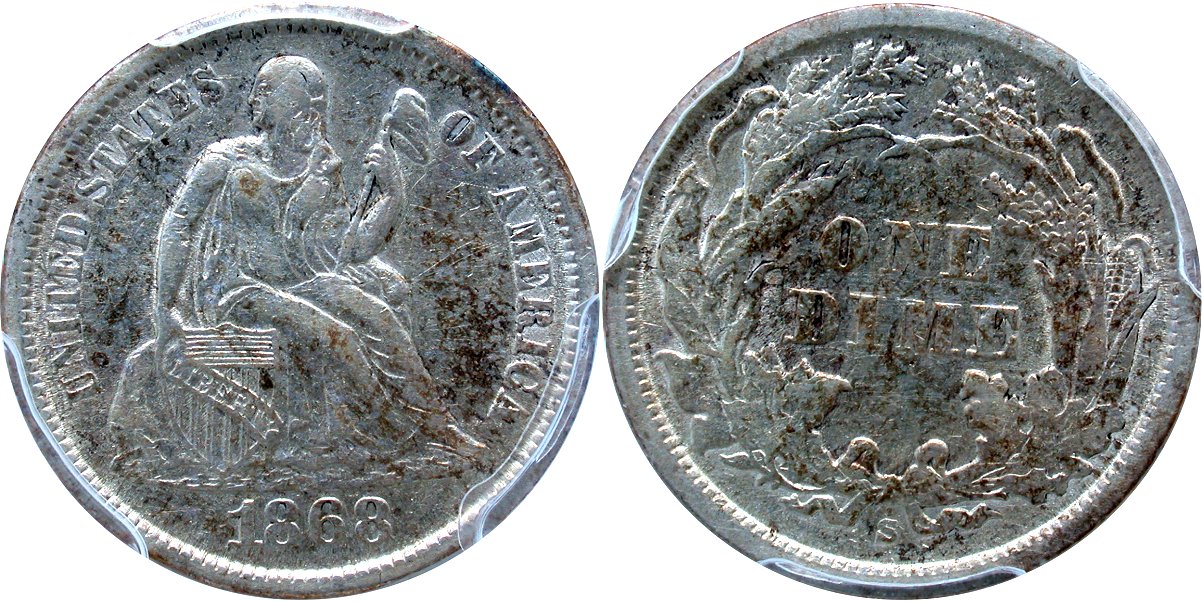 Near-Choice Original, Steven Vitale Collection.. The entire 1868-S mintage of 260,000 was accomplished with a single pair. Those dies suffered significant erosion during later die states. Heavy metal flow lines will predominantly be seen on the reverse along with weakly defined wreath devices as is the case for this Vitale Collection specimen. Though the devices are weak, mint bloom has been imparted to both sides with glowing satiny luster during bright light assessment. This piece has been conservatively grade from a wear perspective with AU device details. Housed in PCGS Gen 5.0 (2015) Dupont hologram holder. December 1969