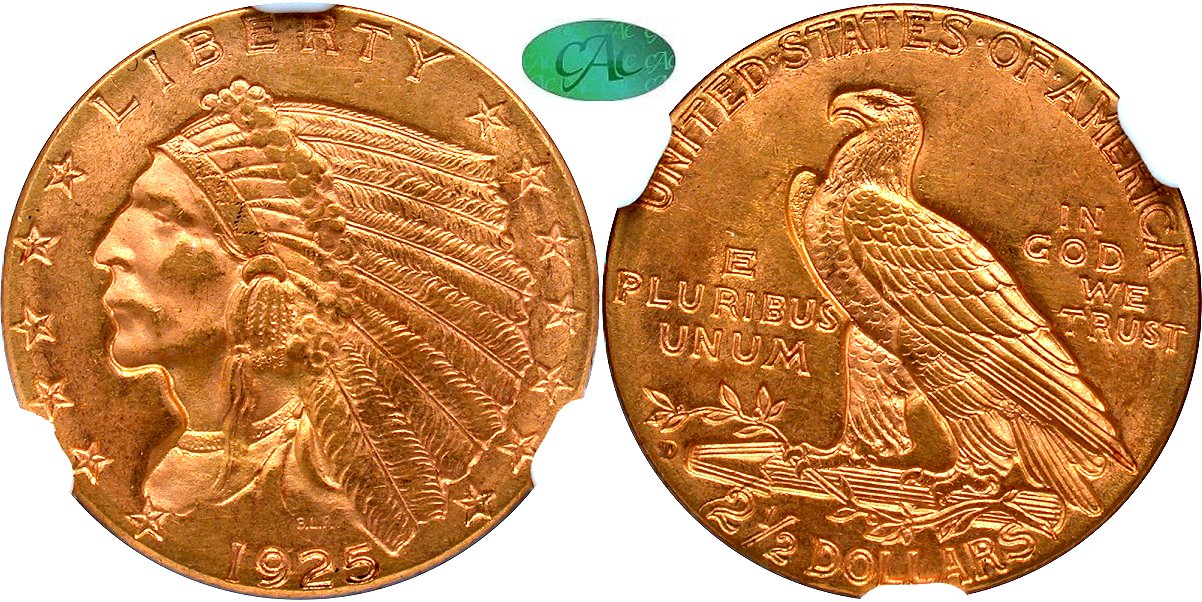 Satiny Luster, Fully Struck, Indian $2.5 Type Candidate. 1925 Denver struck $2.5 Indian gold amounted to 578,000 pieces. This choice Mint State survivor exhibit satiny luster that has a granular textures. Strike is complete. Well preserved and ideal for a moderately themed U.S. gold type set. Housed in new large font NGC holder with CAC approval. December 1969