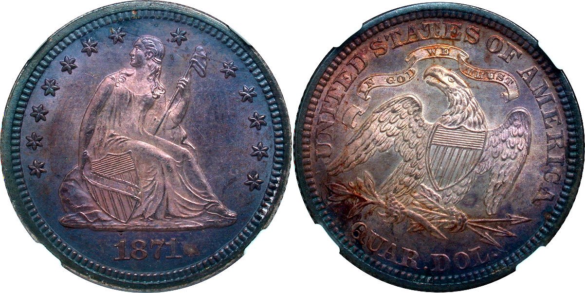 Gorgeous Eye Appeal, Granular Frosted Luster, Dancing Cartwheels, Near Gem Original. Consignor Price Reduction. One of my favorite lots in this late April consignment is this 1871 Briggs 4-C quarter with sports rich granular frosted luster and intense coloration. This piece is downright gorgeous example from a mintage of 118.200 pieces. Few were preserved in Mint State based on the single digit populations and infrequent auction appearances. Bright light viewing is a joy given the radiance and dancing cartwheels. Obverse coloration is primarily rose with peripheral blues at the stars and into the rim. Varying shades of copper-gold are noted on the reverse and accurately illustrated within the images. Strike is 100% complete when considering how the Type II design hubs are notorious for weak strikes. Partial wire rims are noted on both sides. A 10x inspection revealed an ancient line from start 7 through the top of head and into the cap. To the untrained eye this would appear to be a toning line but in reality is a faint line in the surface. I suspect this line is as made given how well the balance of the surfaces are preserved. Housed in new large font NGC holder. December 1969