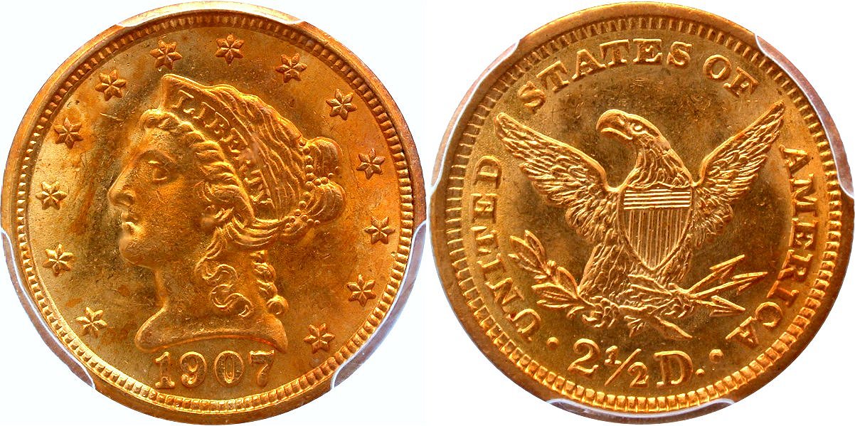 Choice Original, Frosted Luster, City by The Bay Collection.. Consignor Price Reduction. The rich orange and fiery red patina of this colorful quarter eagle will appeal to aficionados of toned gold coinage. Lustrous fields host mixed shades of tangerine, copper, and yellow gold, and overall eye appeal is pleasing. This issue represents the final year of the Liberty Head quarter eagle design, concluding an extensive 67-year series. The PCGS price guide value is $850 in MS64. Housed in a PCGS Gen 4.6 (2013-2014) holder. PCGS #7859. December 1969