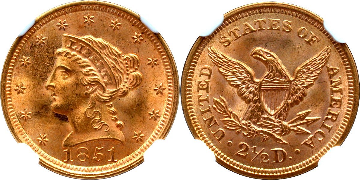 Glowing Satiny Luster, Honey-Gold, Near-Gem Original, Oregon Beaver Collection. Yes, the 1851 Philadelphia struck quarter eagle achieved a mintage of 1,372,748 rendering it as an early "common date" that is readily accessible in the Mint State grades. Therefore, collectors can be selection as to a representative in their sets. The Beaver has released a pretty near-gem with soft glowing satiny luster as the mint frost has a fine granular texture. Coloring is a honey-gold with hints of green hues under light. The surface are essentially unabraded while the strike is weak in the centers. Housed in new large font NGC holder. December 1969