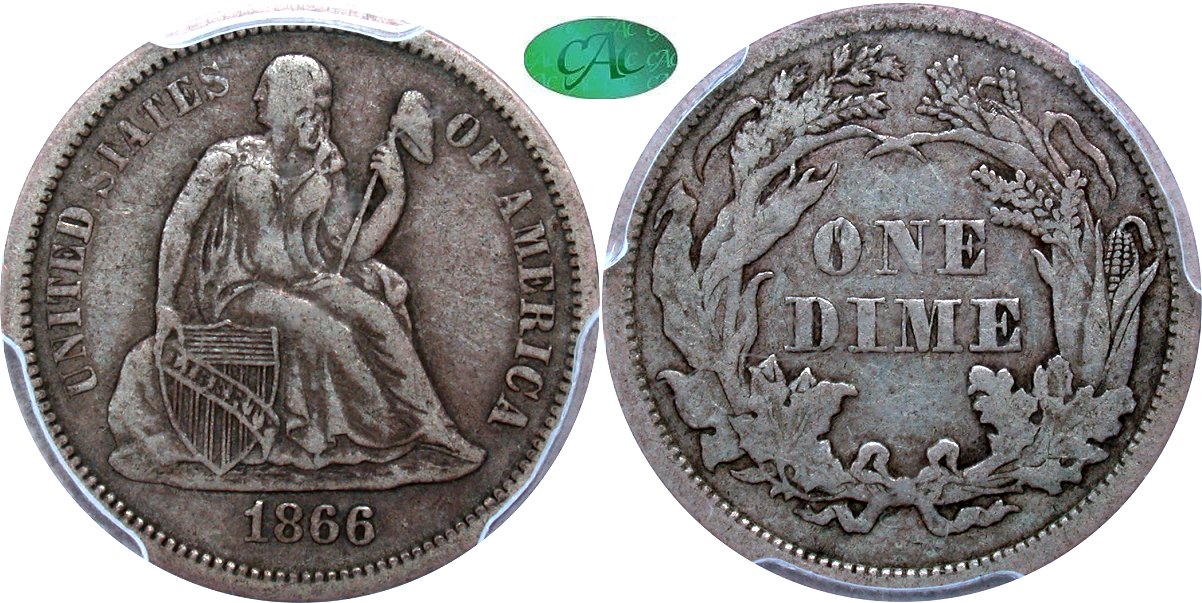 Gem For Grade, Crusty Gray Patina, Very Faint S MIntmark, Tenafly Collection. A gem original 1866-S dime that needs little discussion. Pristine fields are covered with crusty gray patina on the obverse and lighter shades on the reverse. The GFRC camera has amplified turquoise shading on the reverse when the color seen under loupe is gray. Note how the S mintmark is barely visible on this strike, a common occurrence for the F-101 die pairing. Accurately graded and housed in PCGS Gen 4.6 (2011-2013) holder with CAC approval. Worthy of a JUST BUY IT NOW recommendation. December 1969