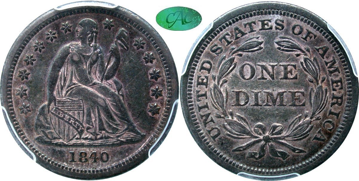 With Drapery Type, Choice Original, Massachusetts Collection.. 1840 brought the final year of the beloved Gobrecht No Drapery design and a transition to the new With Drapery Sully/Gobrecht design towards the end of year. Few of the new design type were saved by East Coast collectors. As a result, the 1840 Drapery design is very scarce in circulated grades and rare in Mint State. The CAC population exemplifies this as the current census 32 pieces. Nearly all are clustered at the VG10 through EF40 grades. Bidders should seriously consider this EF45 specimen that has been approved with no AU50/AU53 examples stickered. Natural deep gray patina reveals embedded orange under a bright light. Surfaces are unabraded and quite pleasing. The Massachusetts specimen is the second of the two CAC EF45 examples handled by GFRC with this lot being the superior of the two and deserving aggressive bidding. Housed in PCGS Gen 6.1 (2020-2025) holder with CAC approval. PCGS #4578. December 1969