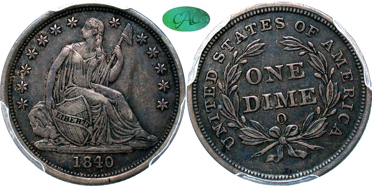 Large O, Rare Die Pairing, Near-Gem Original, Tenafly Collection.. Another Tenafly Collection lot that was sourced from GFRC as a long standing Seated dime in the Gerry Fortin reference collection. Large O 1840-O dimes are very scarce as compared to their Small O counterparts. The F-102 die pairing is rare and might be under estimated at the present R5 rarity rating. This is the lone F-102 ever offered by GFRC. This crusty original specimen was purchased during February 2001 and become the F-102 plate coin within The Definitive Resource for Liberty Seated Dime Variety Collectors online reference. Conservatively graded as should be readily apparent when viewing the images. Strike is complete with bold motifs. Surfaces are toned an even gray with embedded blues on the reverse. A special offering that belongs in an advanced collection. Housed in PCGS Gen 5.0 (2015) Dupont hologram holder with CAC approval. PCGS #4574. December 1969
