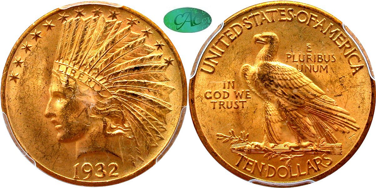 Brilliant Frosted Luster, Rich Honey Green-Gold Coloration, CAC Approval. Bright light view exposes the positive attributes of this lovely 1932 $10 Indian which are certain to please the new owner. First is the brilliant frosted luster and vibrant cartwheels. Second is the rich honey green-gold coloration is that fully natural with a bit of a crusty appearance. Surfaces are well preserved while the certified grade is accurate. With spot gold making a run about the $2000 mark, we can expect Indian design gold to become that more popular. Housed in PCGS Gen 4.5 (2012-2013) holder with CAC approval. December 1969