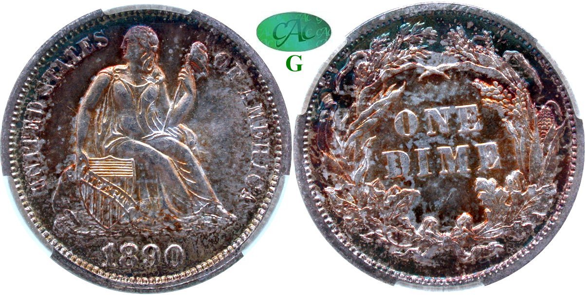 Date Farthest Left Die Pairing, Gem Eye Appeal, Brilliant Frosted Luster, Dancing Cartwheels. Brilliant frosted luster is readily apparent the moment that I placed this near-gem 1890 F-115 dime under a bright. The overall eye appeal is at the full gem level given the brilliant luster and dancing cartwheels. A hammered strike increases the charm with boldly defined reverse wreath included those pesky upper left wheat grains. Mottled orange-rose toning is accented with blues at the upper reverse. The luster and toning combination is lighter than illustrated with my images. A single contact mark above the right breast accounts for the (+) grade, without that mark this is a slam dumb "65". The F-115 die pairing features an obverse with the date positioned farthest left among all dies seen. Housed in new CAC Grading holder and graded consistent with CAC approval standards. December 1969