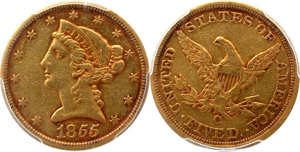 Choice Original, Extensive Regional Circulation, Green Gold, Peripheral Orange-Gold, White Pine Collection. Another White Pine Collection release, this nicely preserved 1855 Charlotte half eagle saw only 39,788 struck. A very scarce date when choice given extensive circulation in the southern Atlantic states. Current survival estimates are tendered at 500 pieces with most in the VF to XF range. This example features a base green-gold coloring overlaid with orange-gold at the peripheries. Wear is light with typical chatter in the fields with residual frosted luster noted at the borders. The overall presentation is quite satisfying, despite the more modest grade. This pleasant half eagle is destined to delight fans of early branch mint U.S. gold. Housed in PCGS Gen 6.0 (2015-2020) holder. December 1969
