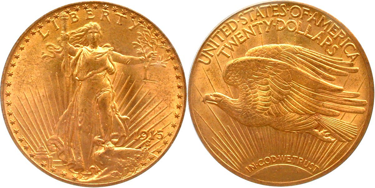 Satiny Frosted Luster, Honey-Gold, Choice Original, Accurately Grade. At first viewing, this choice 1915 Saint radiates satiny textures as compared to brilliant mint frost seen on many examples. Coloration is honey-gold with vibrant cartwheels. There is a contact mark at the bottom of the olive branch that hold back a higher grade. Housed in PCGS Gen 4.0 (1998-2002) holder. December 1969