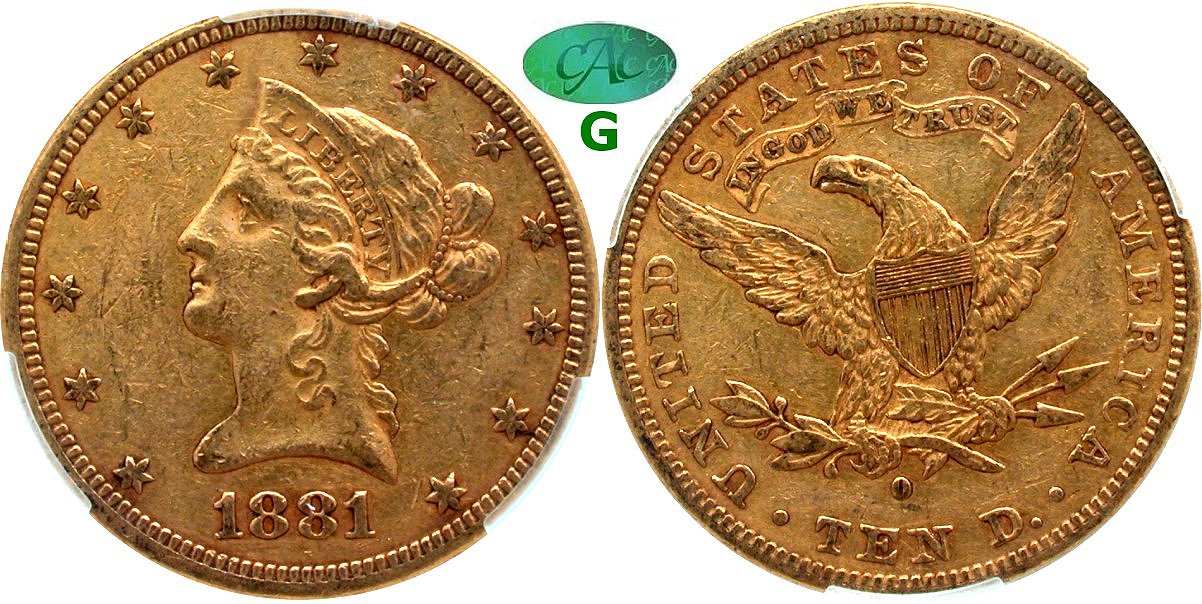 Underappreciated Low Mintage New Orleans Issue, Circulated Copper Green-Gold, Strict CACG Grading. Only 8,350 $10 gold pieces were struck during 1881 at the New Orleans mint. This is an underappreciated, low mintage date with a peak population at the EF grade level per the PCGS price guide. Looking at the CAC guide the census is 32 with seven in EF. Pricing premium escalate quickly in AU with hand full in Mint State. This 2025 FUN show acquisition is well preserved with coppery green-gold coloration and residual steely reflectance under angled lighting. The fields are minimally abraded given the time in circulation. Fully choice and guaranteed to please the new owner. Housed in new CACG holder and graded to strict standards employed for CAC stickering approval. December 1969