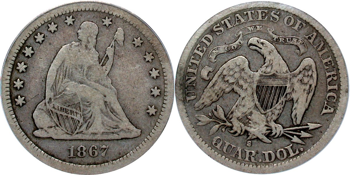 1867-S PCGS F15 25C                                                               1871-S PCGS VG10 CAC 25C