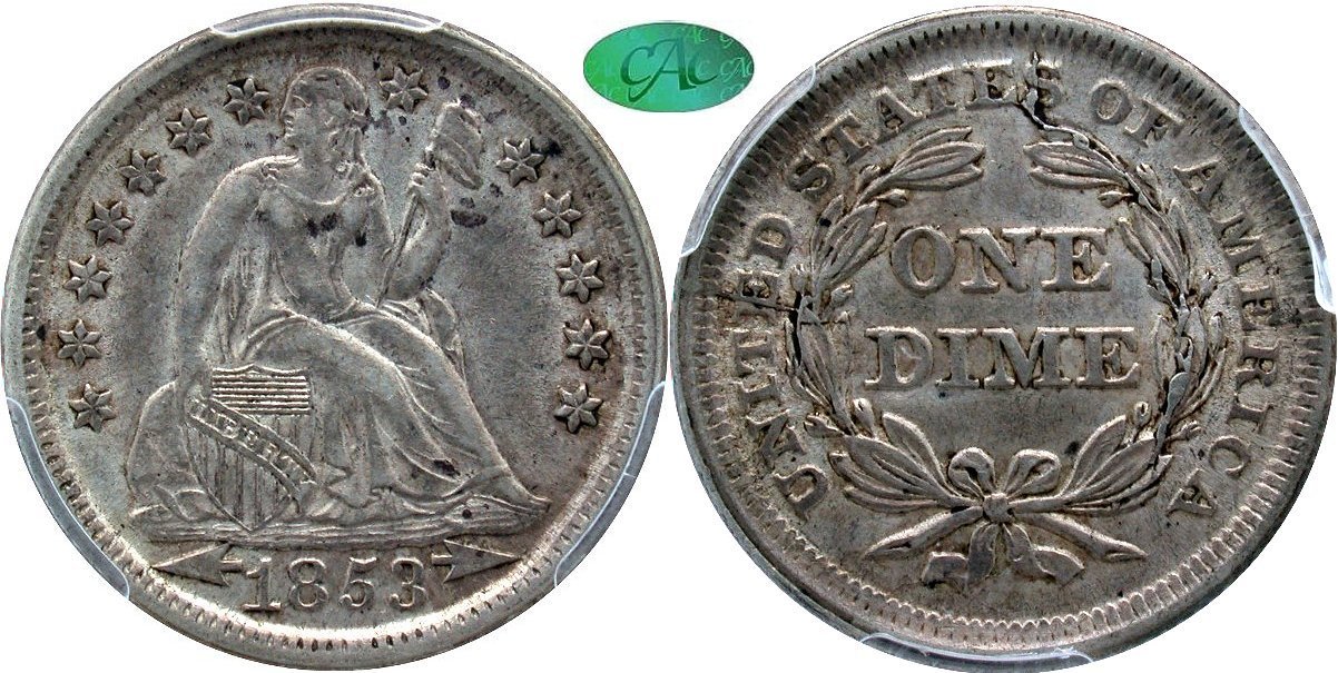 Talk about a cool offering! I'm most pleased to be showcasing a quality lot of Liberty Seated Dime die varieties this morning. Demand for Seated dime varieties continues to be strong with supply being the ongoing issue. This lot brought a new 1853 With Arrows die pairing; heavily cracked Repunched Date obverse with a fresh reverse die. An 1853 A&R quarter with rotated reverse was added for good measure. Orders for this lot have been furious after posting a portion late last evening.