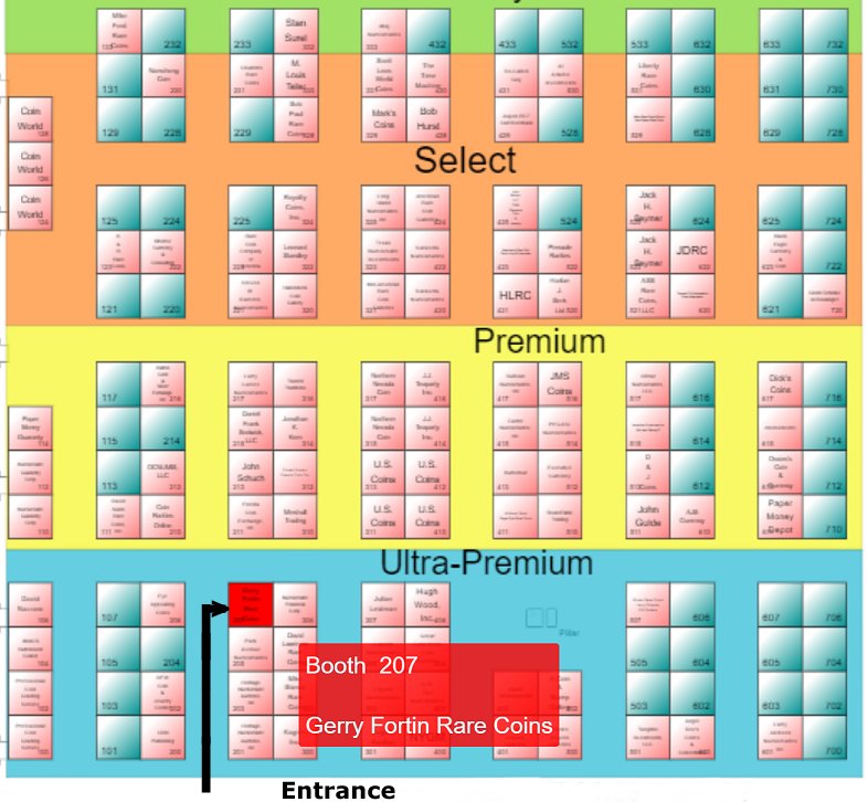 The GFRC Booth 535 will be hosted by our wonderful staff. Diane and Rose Marie are so elegant and will glady help you shop through our eight cases of offerings. Dan will be manning the two United States gold cases while Gerry will be at the laptop scanning items, quoting prices, meeting customers, and availabe for buying coins too. The FUN show is also an excellent time for insourcing large and small consignments. We have unlimited space for transporting coins back to the Venice office as compared to flying with hand carry luggage.