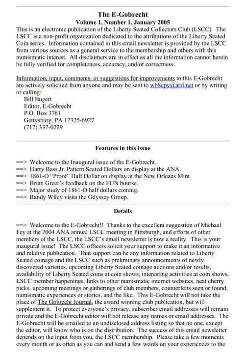 The E-Gobrecht was the brain child of Bill Bugert and Michael Fey. Bill took on the challenge of preparing a monthly LSCC newsletter with the first edition appearing during January 2005. The initial editions were composed with Microsoft Word and had the appearance of a college newspaper. Bill did his best to solicit writers and articles to maintain the momentum of this pioneering effort. During a period of fifteen years, the E-Gobrecht saw continuous improvements based on advancements in publishing technology and Bill's fearless approach towards driving improvements. Many contributors came and eventually burnt out and left due to the demands for writing monthly pieces for the E-Gobrecht. Today's columnists are dedicated contributors who recognize the importance of maintaining this publication. Along the journey, the E-Gobrecht won publishing awards within the numismatic industry and became one of the core products of the Liberty Seated Collectors Club.
