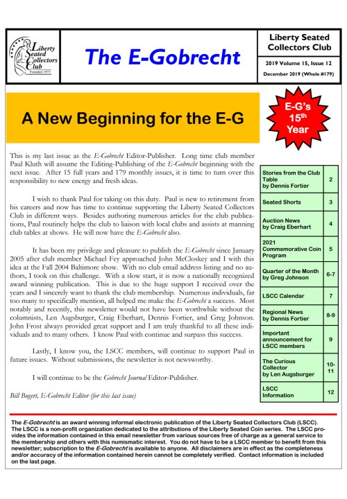 Sunday evening brought the arrival of the December E-Gobrecht as published by the Liberty Seated Collectors Club. Bill Bugert opened the December 2019 issue with an announcement of his retirement as E-Gobrecht editor. After 15 full years of building up the E-Gobrecht publication and 179 monthly issues, Bill is turning over this outstanding monthly club news journal to Paul Kluth.