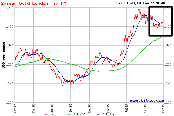 Gold pricing continued to climb on Monday and is currently quoting at $1526/oz. The 10 Year U.S. Treasury yield is flat at 1.9% as 2019 comes to a close.