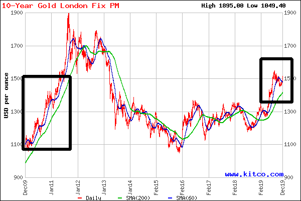 As of this morning, gold spot is quoting at $1515/oz and experiencing a quiet breakout above the $1500 towards its 2019 highs. Below are the 2-Year and 10-Year Kitco trendcharts. The 2-Year clearly illustrates the near term breakout above the 30 day moving average. The 10-Year chart shows the parallel behavior between the 2010 runup and today's trend. During 2010, gold prices would move up and experience a consolidation period followed by another upward break-up to higher levels. I'm expecting gold to behave the same way during 2020 with a $1600 - $1700/oz level by end of year based on the technical charts. The underlying fundamental in Asia are just too compelling to avoid owning a reasonable gold position. My Merrill Lynch money managers will have to put up with me for another year....