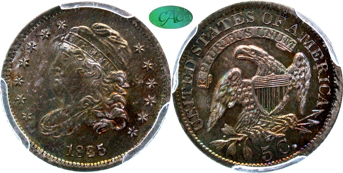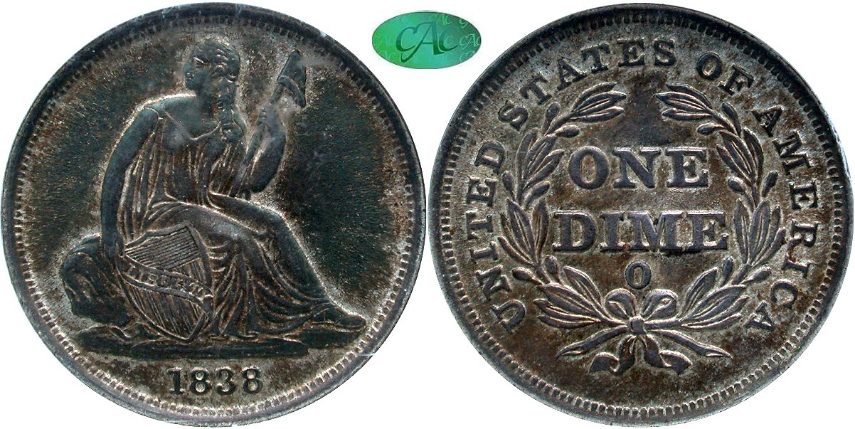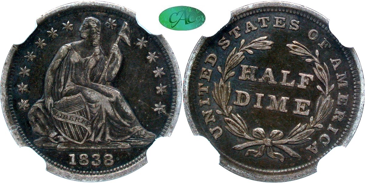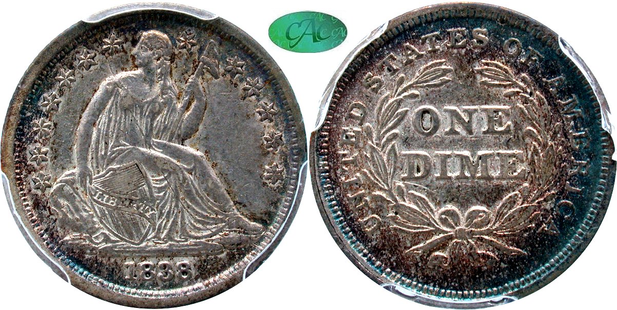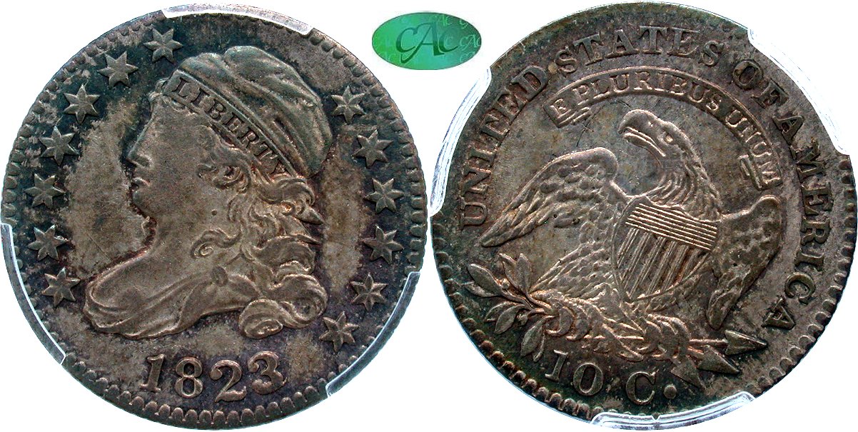 We open with an amazing 1823/2 JR-3 dime that is a Baltimore show new purchase that is not part of the Union Bridge consignment. I could not resist showcasing this piece as the opening image. The 1823/2 date will be found with Small Es (JR-1) and Large Es (JR-2, JR-3). JR-2 is a rare die variety and infrequently seen. The CAC population for JR-1 and JR-3 is similar though the Large E's JR-3 have a higher pricing structure once reaching the AU58 grade level and better. This AU58 example is a crusty gem that screams originality.