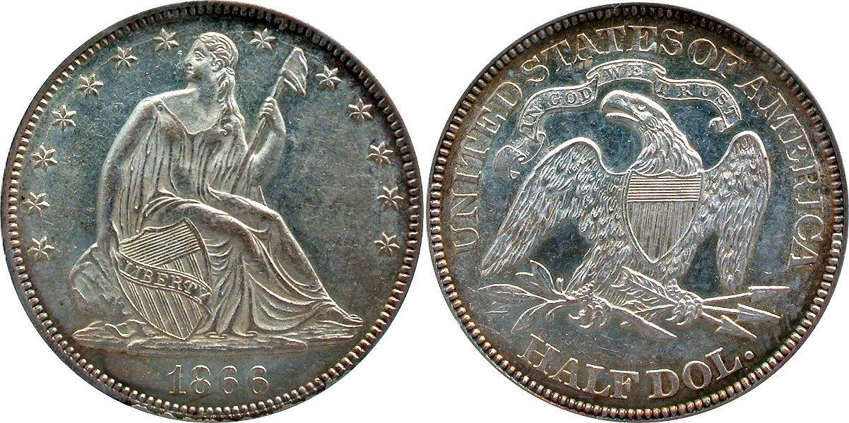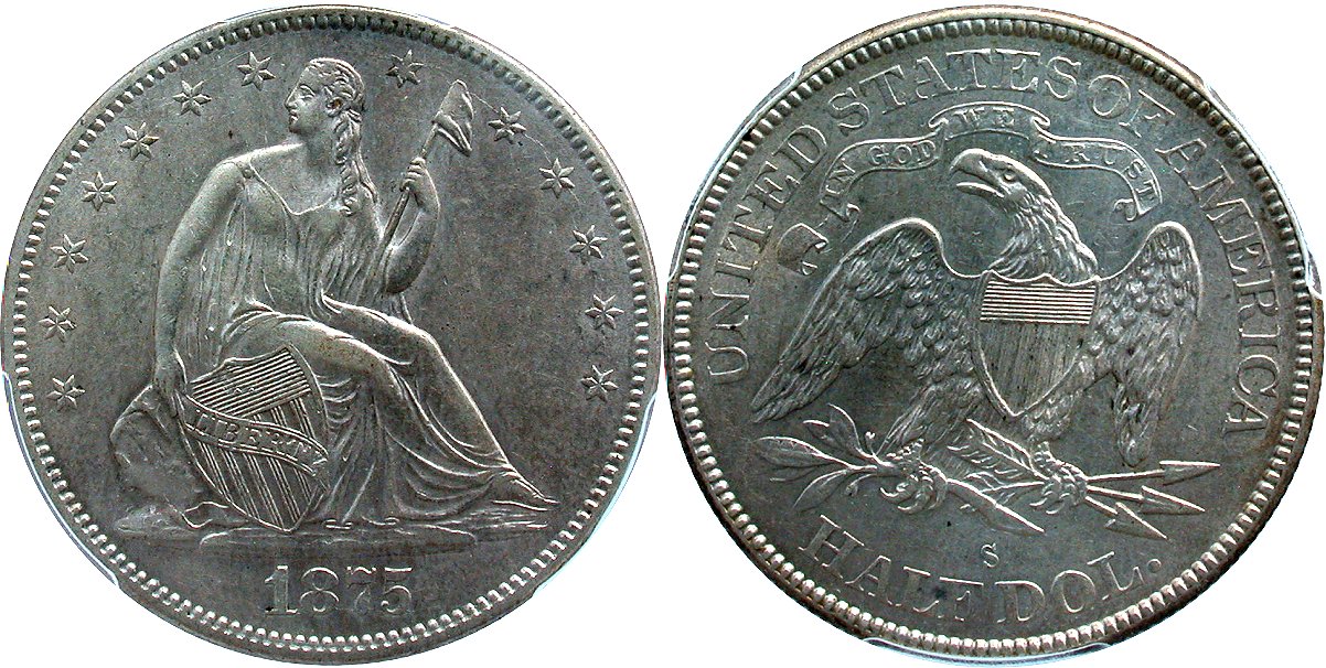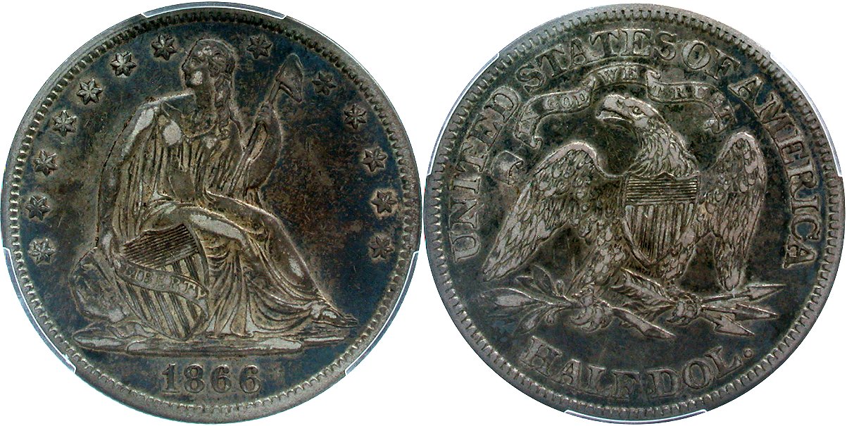 1866 Motto PCGS EF40 50C                1873 DDO WB-109 PCGS VF25 50C              1875-S WB-1 PCGS AU58 50C