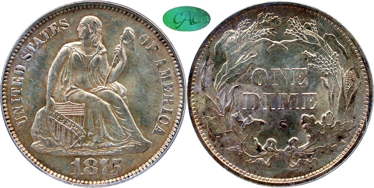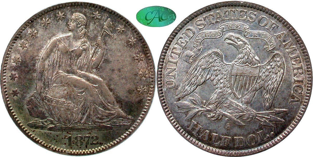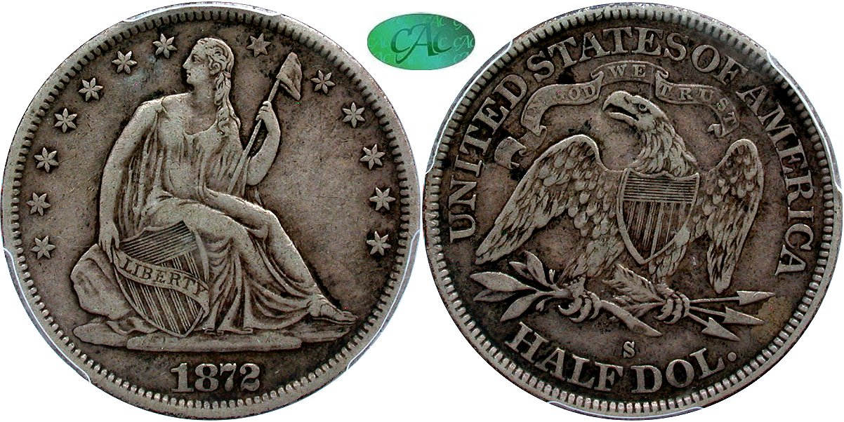 1872-S PCGS VF35 CAC 50C                                                1875-CC WB-5 PCGS AU53 CAC 50C