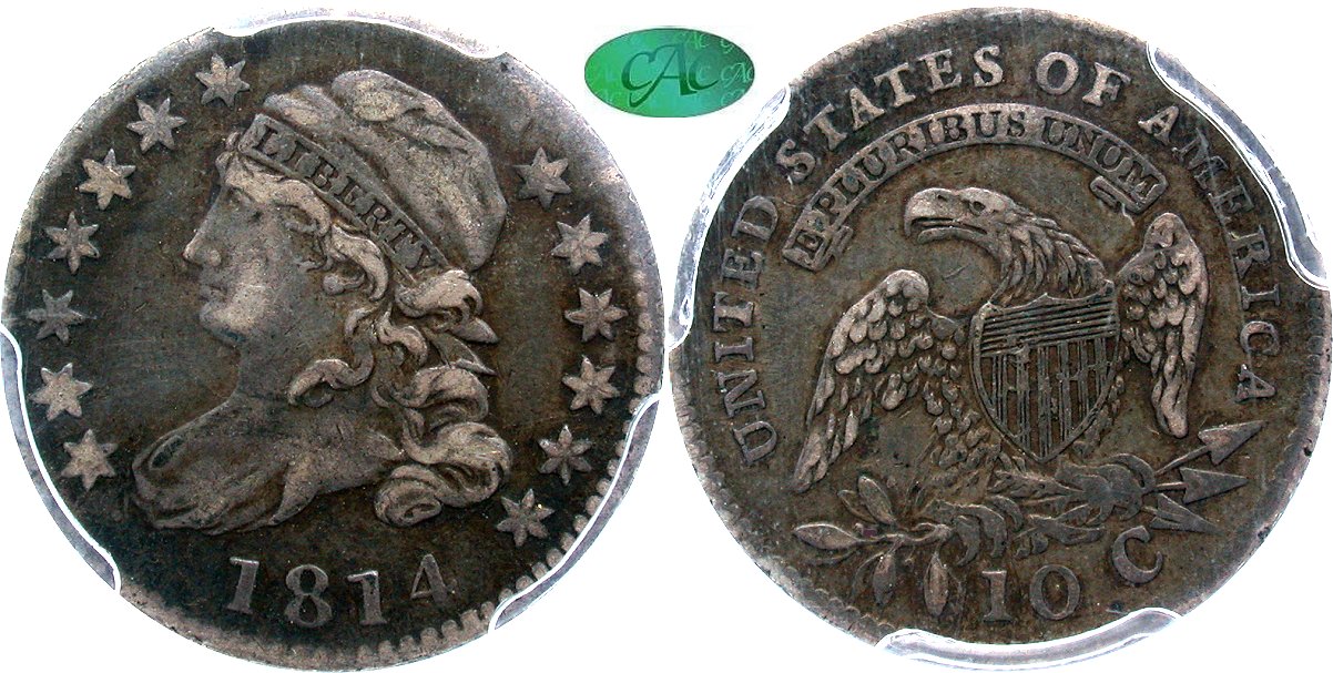 1814 Lg Date PCGS VF35 CAC 10C                                             1828 PCGS Lg Date VF25 10C