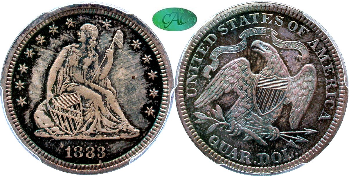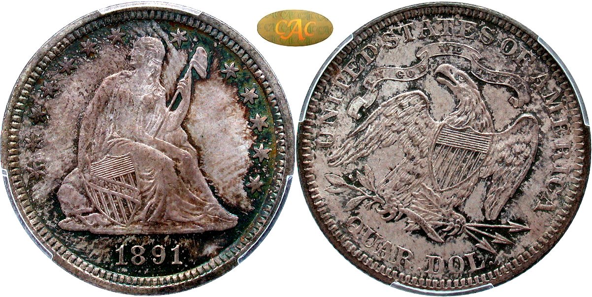 The 1833 LM-3.3 Capped Bust half dime is simply gorgeous and was requested during the overnight hours. I came close to placing this 1859-O F-103 dime into my own collection due to proof like fields and incredible eye appeal. Since I did not, another serious collector promptly pounced on the piece. It is sold for sure. Remaining is a hairline free 1881 F-101 proof dime in a PCGS Rattler holder and an incredible 1891 Seated quarter. The latter piece is the finest 1891 quarter seen while operating the GFRC business. This is a superb gem and sadly, GFRC images are unable to capture the intense luster.