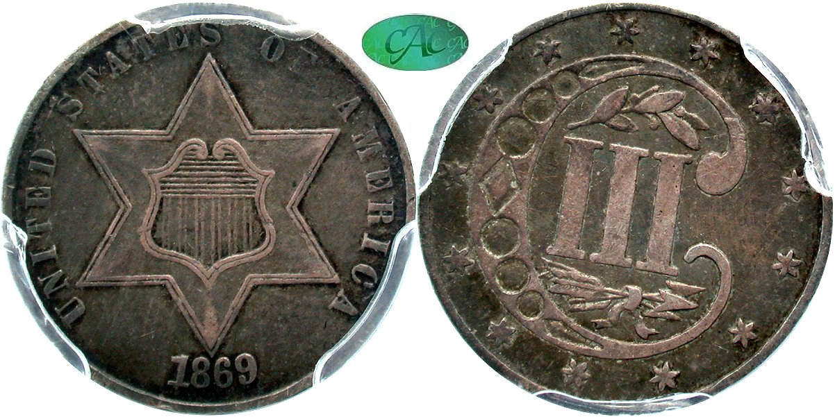 A fair number of Blog readers are probably scratching their heads at this point and looking for their Red Books or firing up the CoinFacts app to get current on an 1869 3 cent silver piece certified as EF40 with CAC approval. I'll save you the effort.