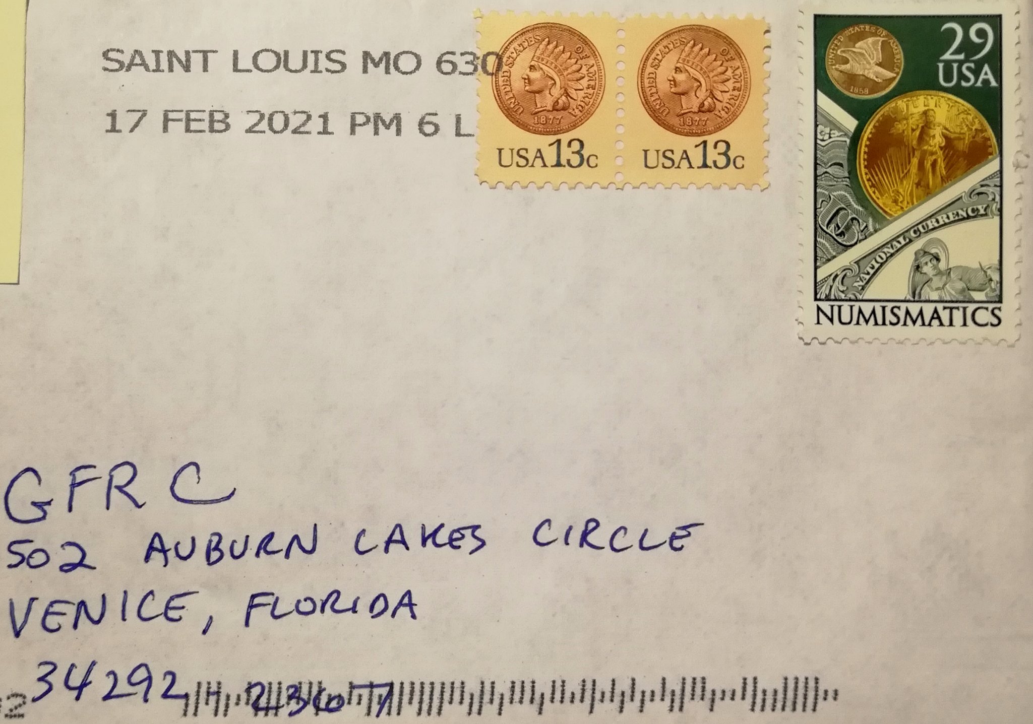 Friday brought a check payment from a new customer. What immediately captured my attention were the stamps with coin images on the envelope. Surely, there would be an explanation with the check payment. I was not disappointed. Following is a quick cellphone image capture of the envelope and stamps.