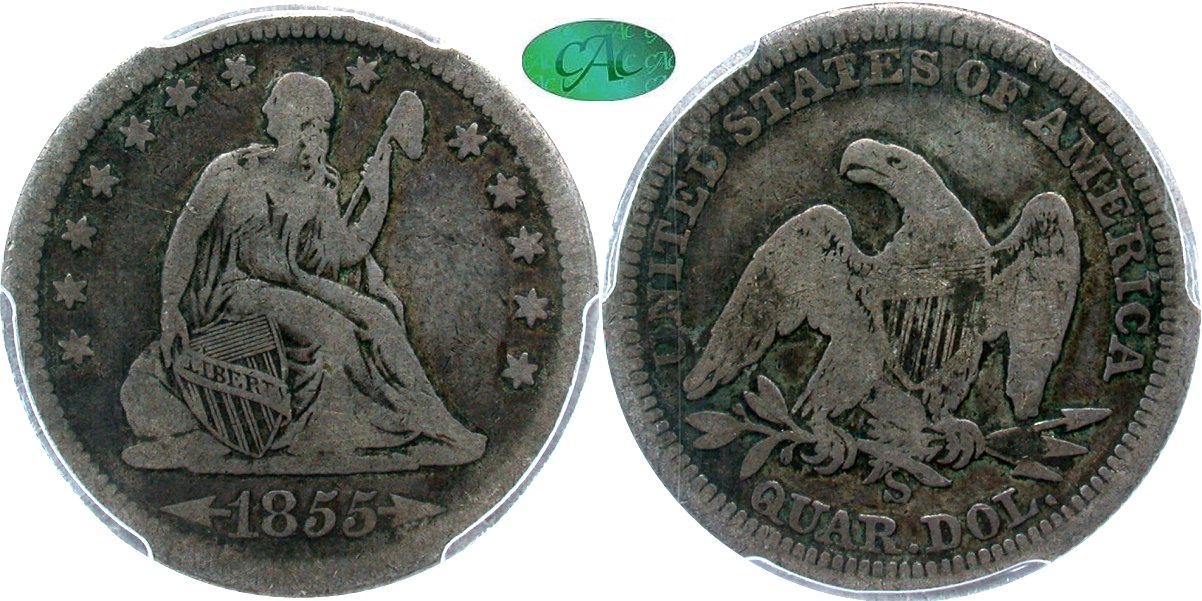 I really like the 1855/54 half as an early die state with the undertype date punch being boldly visible. Next is the 1855-S. Nearly all the 1855-S halves seen have been problematic. They come marked-up, cleaned, or overgraded. This example is one of the nicest original pieces that I have seen in my eight years of operating GFRC. It is worth the reserve from a quality perspective and will not need to be upgraded. Sure you can spend less money and purchase a not so nice or overgraded example.