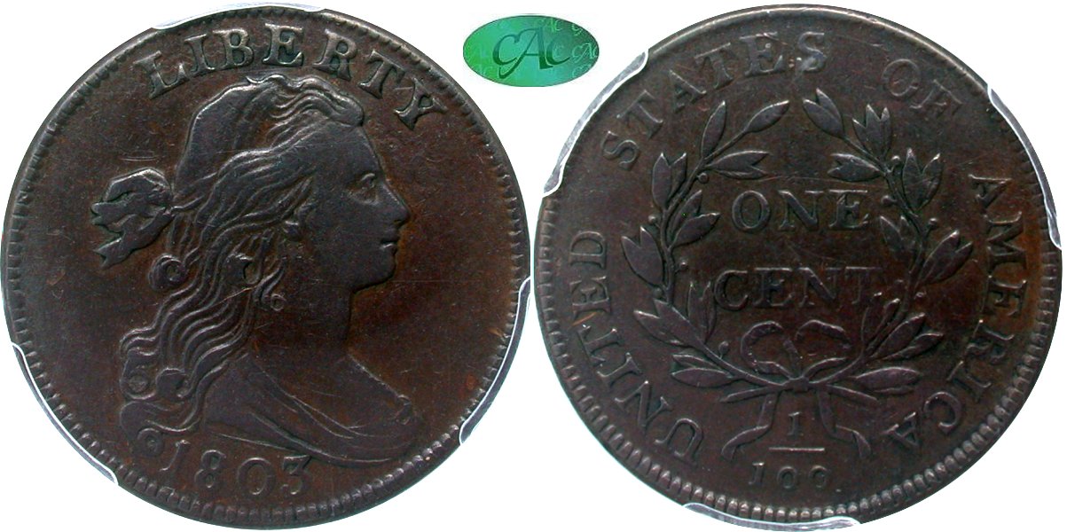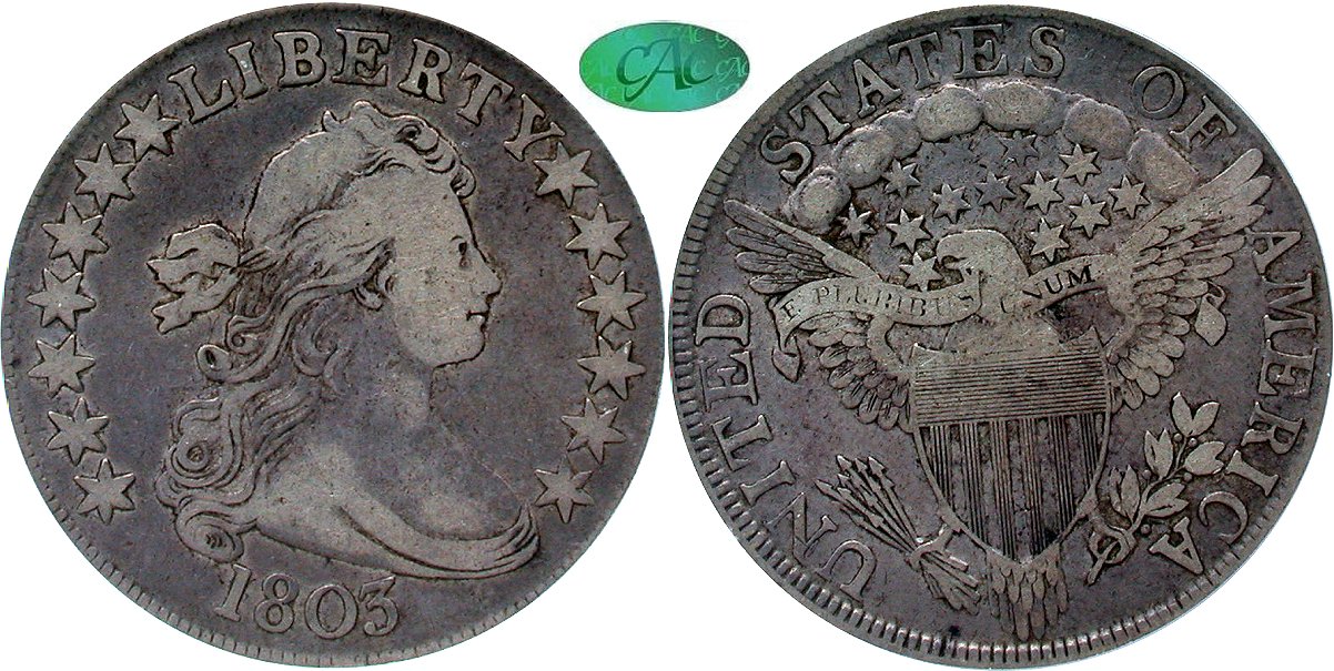 1803 Small Date, Small Frac PCGS VF30 CAC 1C                               1874 Arrows PCGS AU53 CAC 50C