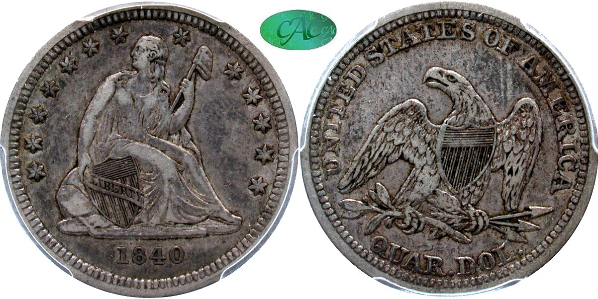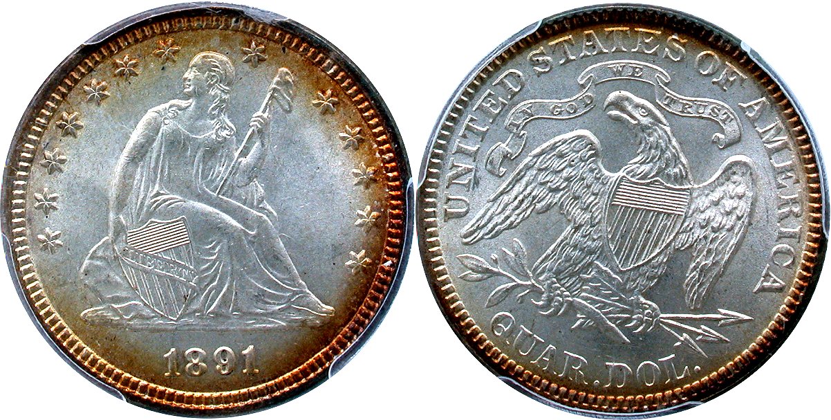 Up next is a small gallery that illustrates new offerings that will load to the price list at some point this afternoon. All four pieces are attractive and pleasing. The 1891 quarter has brilliant luster surrounded by golden peripheries. The 1838 Reeded Edge half is also super attractive. If these two pieces had CAC stickers, the asking prices would be much higher.