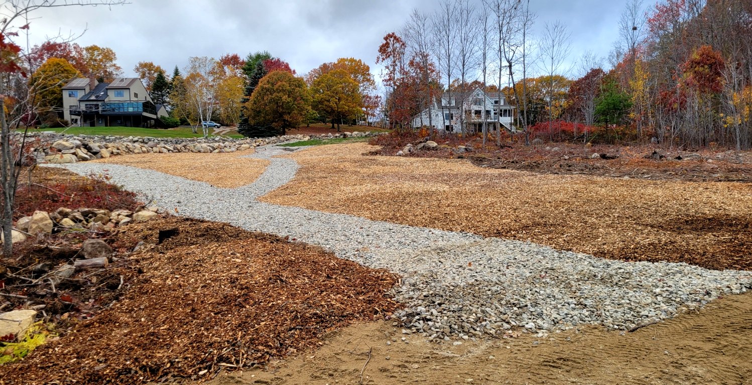 Much of Friday afternoon was spent on Johnny2 with a concerted effort to complete the landscaping of the newly cleared back acreage area that has been frequently featured in the Blog. Back and forth I went between the gravel, 3/4" stone, and wood chip piles to the cleared area to complete this project. 5:00 PM Happy Hour arrived and it was time to wrap up for the day. This image was taken and showcases substantial progress that I am most proud of. Both the Fortin and Dodson homes are nicely illustrate against dark clouds at the top of Ledge Hill. Come next spring, the barren unfinished area to the right will see light green ferns sprouting that will provide a nice contrast to the wood chips.