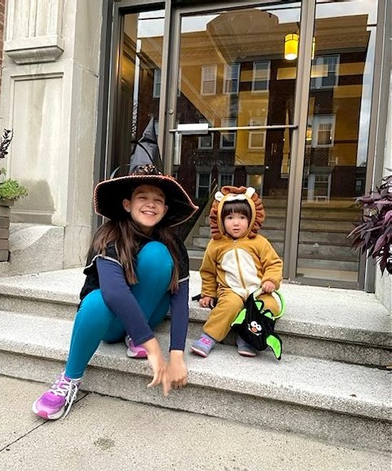 Let's close today's Blog with a lovely snapshot of Natsumi and Ayumi Yamatin all dressed up for Halloween. Chikae and Matt shared Natsumi's and Ayumi's Halloween trick or treating adventures via a video call during our Happy Hour. In the Brookline Coolidge Corner area, there are two residential streets that host annual Halloween events where kids can freely roam and load up on candy placed in containers outside ghoulishly decorated homes.