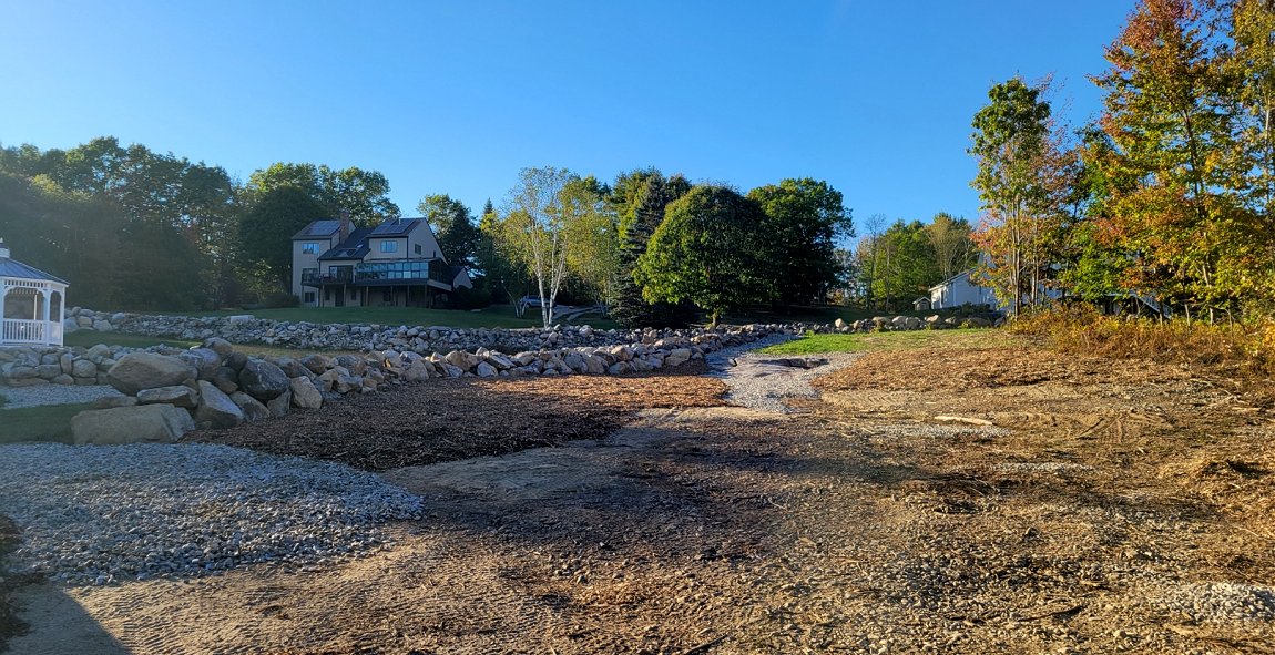 Thursday's rain brought an opportunity to complete the grass seeding of the topmost section behind the newly constructed stone wall. I had been waiting for the right moment when there would be sufficient rain to justify placing seed into the ground and yesterday worked out just fine. The below image was taken while composing the Blog at 7:30 AM, thus the long shadows from a low sun in the eastern sky. The beautiful clear blue skies at the top of Ledge Hill providing for a lovely contrast to the yellow-green landscape and the brown dirt. If looking carefully, you will note that three feet of crushed stone, with weed mat underneath, was first installed against the stone wall before the final leveling with Johnny2 and hand removal of the remaining stones and exposed roots. The crushed stone nicely fills the space between the rocks and also simplifies weed management. The entire task was accomplished during the morning with light rain underway. The final step was hand spreading two straw bales to cover the newly seeded area in an attempt to hold the moisture in the ground. Now that this section is seeded, my attention shift to the sharply downward sloping area and the exposed ledge outcrop for cleanup along with a sloping ground management solution. There is an idea percolating in my mind.