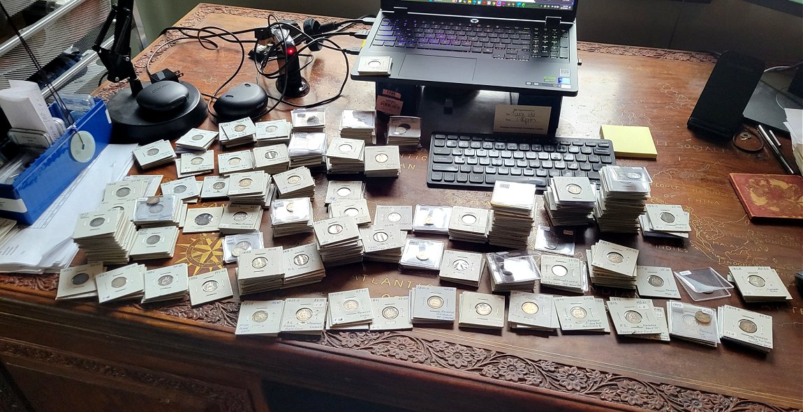 Following is an image of the office desk once all of the remaining raw Liberty Seated dime web-book plate coins were sorted by date and mintmark. I was not kidding when estimating, in a prior Blog edition, that there are about 300 or so dimes that needed to be photographed before their release back to the market place. This process will take time and probably last through all of 2026. To speed up the release process, if you who like to secure certain die varieties/web-book plate coins, then by all means send me a list of those dimes. But first, please check the Sales Archive to learn if that dime has already been sold. Another easy way to see if a plate coin has been sold is to check the web-book images. If an image is soft with low contrast, then that dime is likely in the 2x2 boxes. If the image is sharp with good contrast or is TPG certified, then that dime is likely no longer in inventory. I will study those lists once in Florida and will revert with what is on hand and a potential availability time frame. The web-book update project is not urgent and not a top priority so please adjust your expectations accordingly.