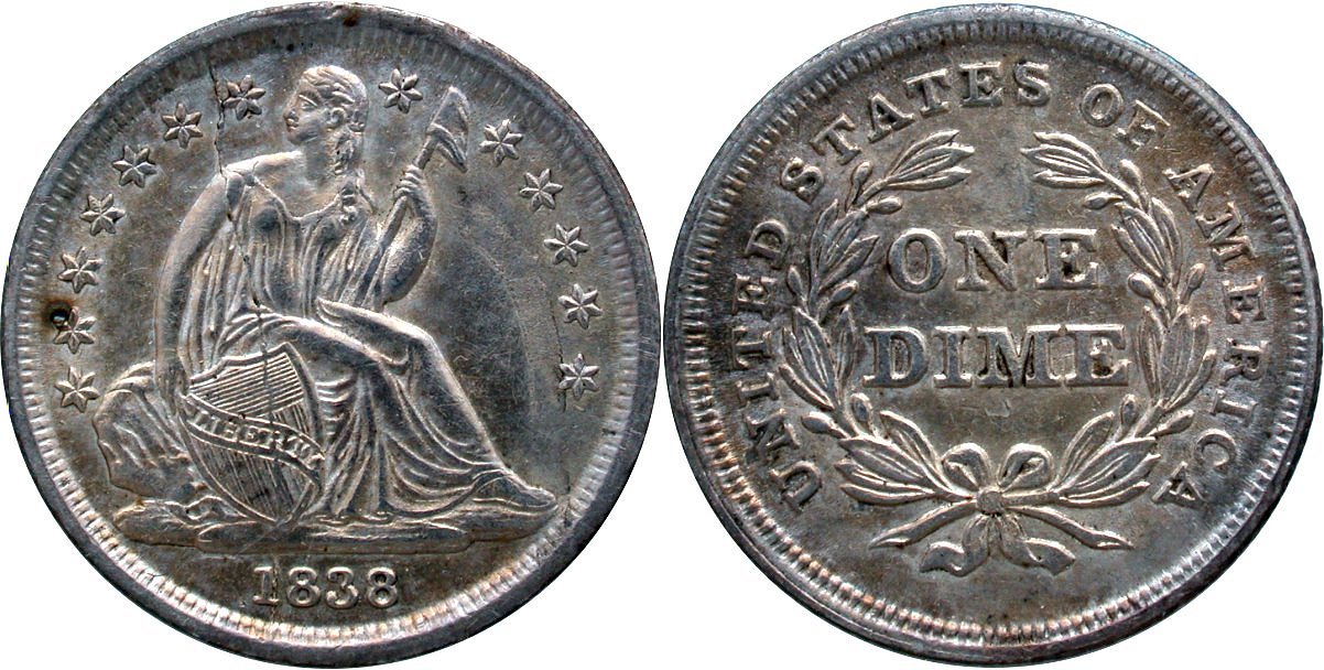 Gem $3000 Large Stars, Reverse Die Flaw, Gem Original, Massachusetts Collection.. This1838 F-105 reverse die flaw example is an unquestionable gem with intense frosty luster decorated by rose-gold coloring. Cartwheels sizzle with the slightest holder rotation during bright light inspection. A hammered strike and pristine surfaces enhance the eye appeal. This lot sports an important legacy as the F-105 plate coin within The Definitive Resource for Liberty Seated Dime Variety Collectors online reference. CAC has approved 125 in all grades with 28 finer. CAC pricing is $1950 in MS64 and jumping to $3150 at the full gem level. Housed in PCGS Gen 6.1 (2020-2025) holder with CAC approval. Ex. Gerry Fortin Reference Collection and previously sold May 2021. PCGS #4568.
